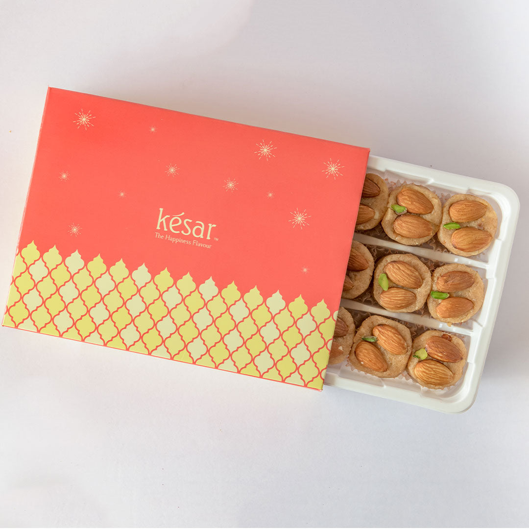 Indulge in the rich, comforting taste ofBadam Pinni from Kesar Sweets. This traditional Punjabi delicacy is crafted primarily from roasted almond flour (Badam) and pure clarified butter (Ghee), creating a dense, melt-in-your-mouth texture. Each pinni is a powerhouse of flavor and energy, often finished with a crowning whole or halved almond.
